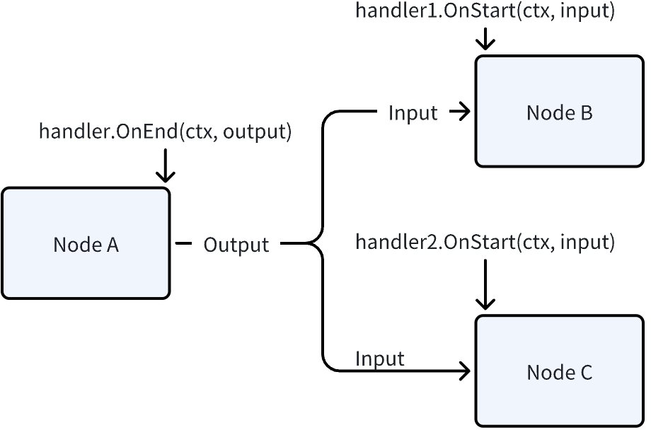 If a Graph Node triggers the Callback, since the Node cannot get the component’s internal intermediate state information and can only get the input and output specified in the component interface, it can only give these to the Callback Handler. For Chat Model, it’s []*schema.Message and *schema.Message.