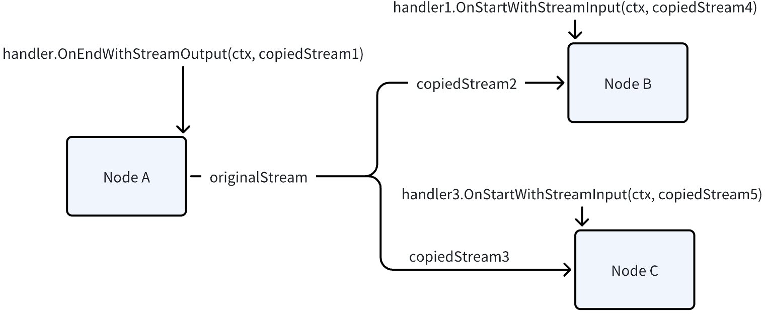 In stream passing scenarios, input streams in all downstream nodes and handlers are streams obtained from StreamReader.Copy(n), which can be read independently. However, each chunk in the stream is direct variable assignment. If the chunk is a reference type like struct pointer or Map, the same piece of data is read by each copied stream. Therefore, modifying stream chunks in Node and Handler is also not recommended due to concurrency issues.