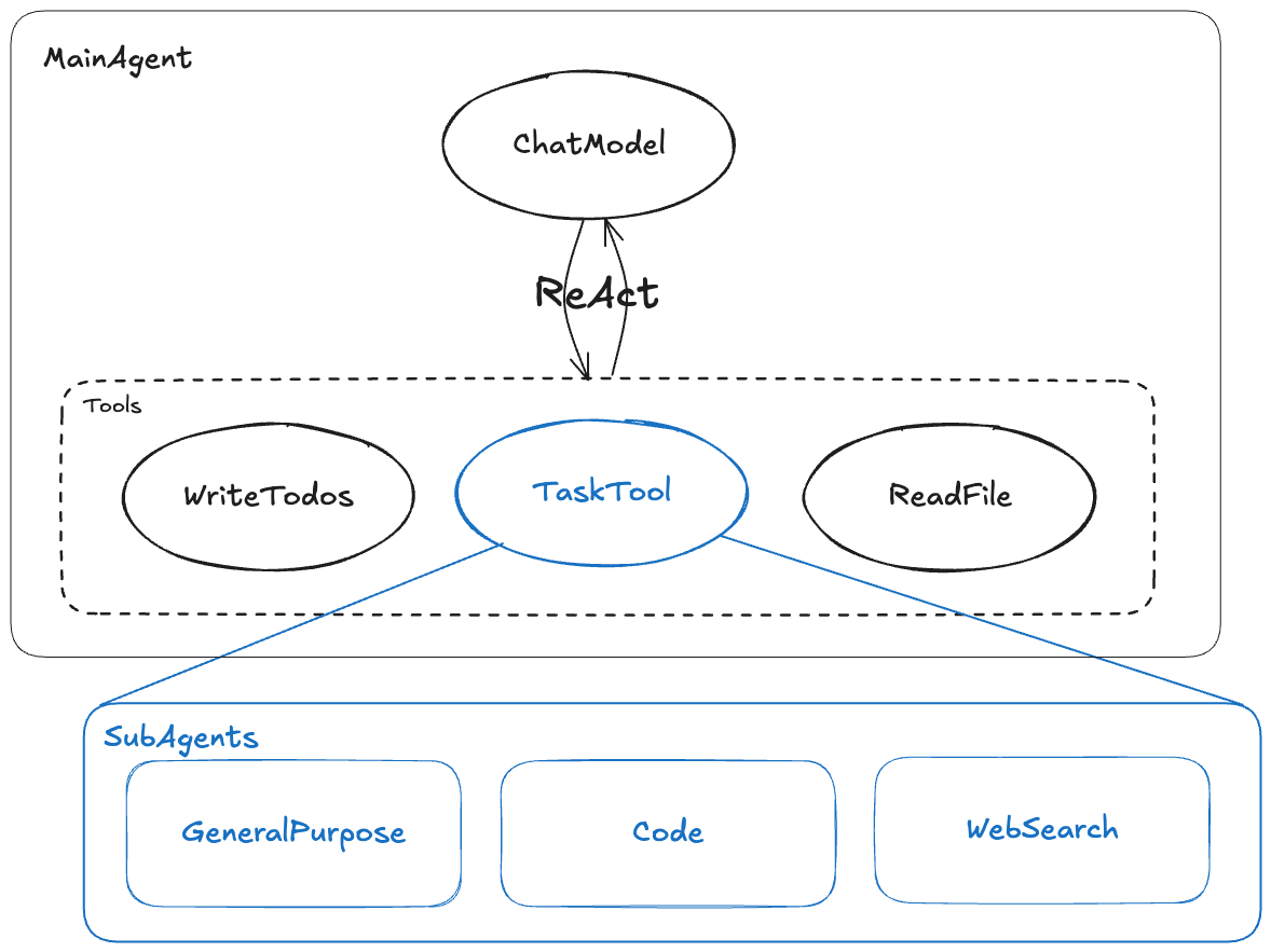 - SubAgents: Responsible for executing specific, independent subtasks, with context isolated from MainAgent.