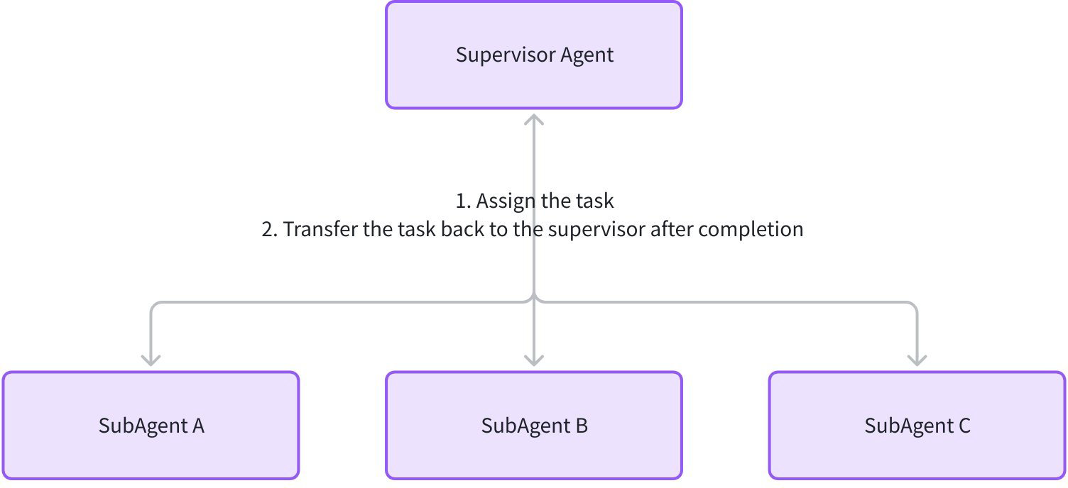 - Centralized Control: Supervisor uniformly manages sub-agents, can dynamically adjust task allocation based on sub-agent execution results (such as assigning to other sub-agents or directly generating final results).