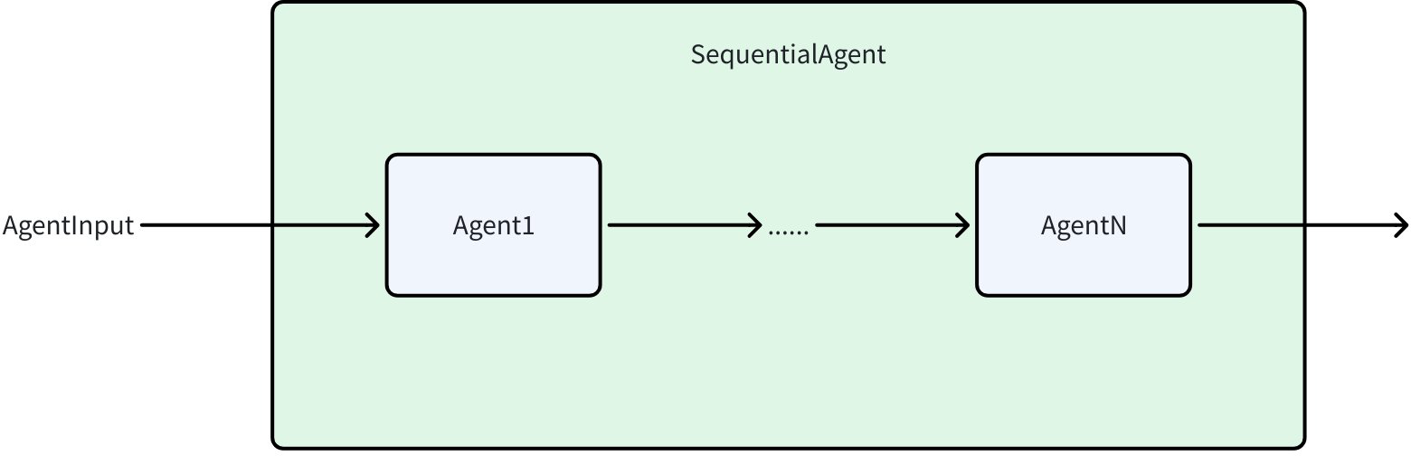SequentialAgent is the most basic Workflow Agent. It executes a series of sub-agents sequentially according to the order provided in the configuration. After each sub-agent completes execution, its output is passed to the next sub-agent through the History mechanism, forming a linear execution chain.