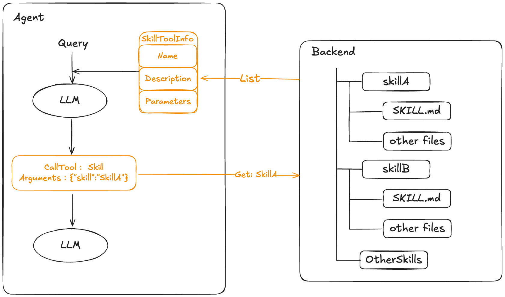 Skill backend interface defines how skills are retrieved. It decouples skill storage from usage: