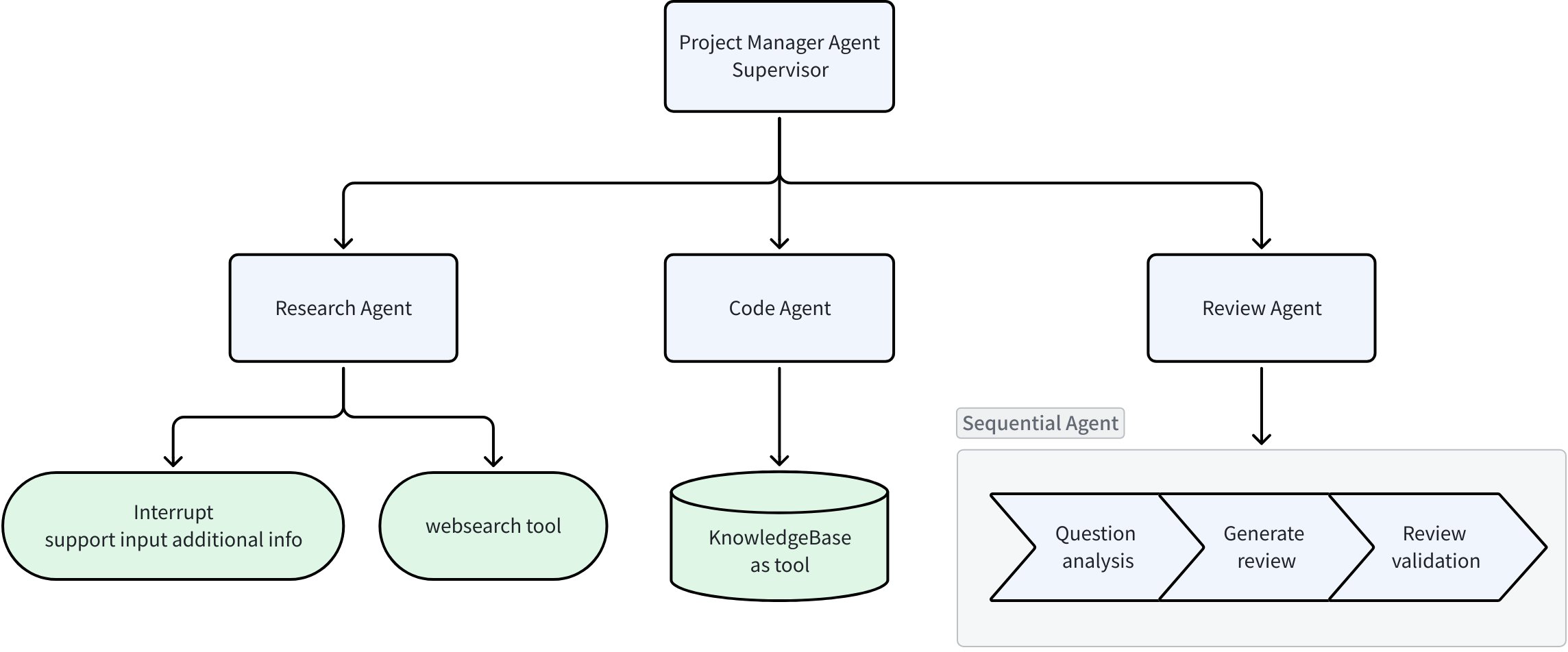 • Project Manager Agent: Project manager agent, using Supervisor pattern overall, with the following Agent functions: